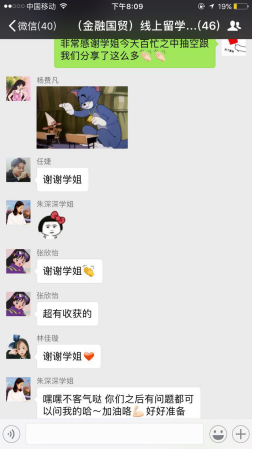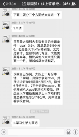 (王晶晶学姐的详细介绍) 10月27日晚20点,在高加加老师以及金融三班团支书顾悦同学的共同组织下,开展了一场面向全体经济大类大三学生的留学经验分享交流会。本场交流会结合同学们的出国意向,同时兼顾国家与院校,共邀请了三位2017届经济大类专业的优秀学姐,分别为:英国伦敦国王澳門漁人码头 的朱深深、香港城市大学的黎玉丹以及澳洲墨尔本大学的马楠。在交流会之外,还联系到了香港岭南大学的张一枫学长以及南加大的郑亦清学姐,便于在之后给同学们提供更多方向的与直系学长学姐交流学习的机会。 本次交流会采用线上形式进行,充分利用新媒体平台的学习分享新载体,跨越海内外,搭建起一个交流学习的良好平台。在每位学姐的分享阶段,参与交流会的同学都积极参与讨论以及提问,井然有序的同时又充满热情。不少同学都表示,此次交流会解答了她们很多在筹备过程中的疑问,也从优秀的学姐身上学到了很多,很有意义。