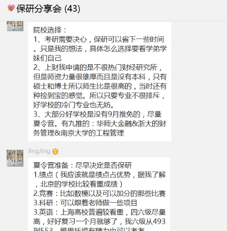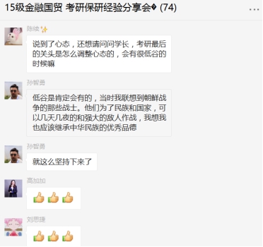 突破迷茫,坚定前路,逐梦新未来 ——2015级金融、国贸举行线上升学方向经验分享会 为解决同学们迫切关注的升学疑惑,从而坚定前路,逐梦新未来,2019届的金融和国贸专业的同学们在经济大类专职辅导员高加加老师的指导下,邀请了2017届、2018届成功升学的学姐学长,于10月24日、10月26日、10月27日分别开展了考研、保研、出国三大升学方向的线上经验分享会。 10月26日晚20点,线上的考研经验分享会率先展开,参与人数达74人。本次考研经验分享会在参考同学们的意愿之后,邀请了成功考取对外经济贸易大学的王宁学姐、中央财经大学的孙智勇学长以及武汉大学的郭蓉学姐。在主持人田君的组织下,首先同学们对学姐学长表示热烈欢迎,并积极参与互动,勇于表达心中疑惑,得到了学姐学长们详细的回答。 王宁学姐倾情分享了她的备考教材,各科都非常详尽,为同学们指明了方向,为她点赞!孙智勇学长谈起低谷时,联想到抗美援朝战士们的坚韧品格,誓要传承中华民族良好品德,令人动容!郭蓉学姐分享了从早到晚泡在图书馆的备考经历,为同学们身体力行地讲述了“天道酬勤”的真理。