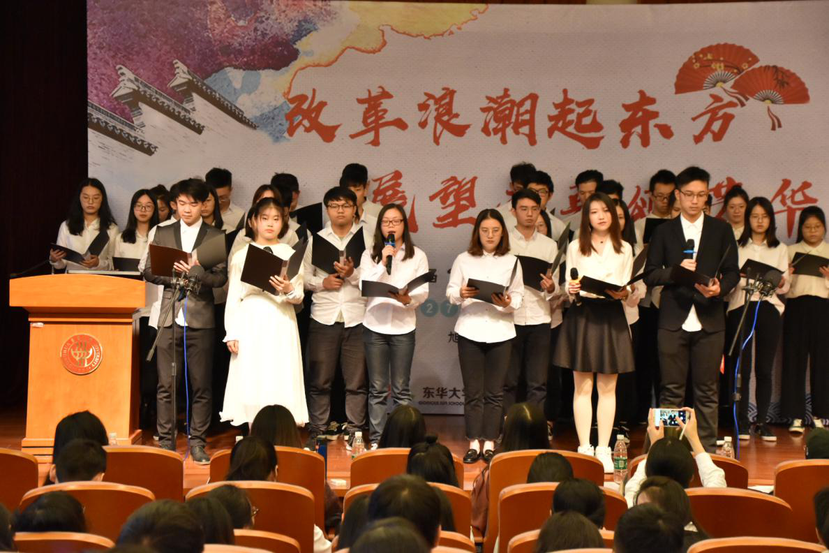 “我们在东华,传递未来的希望,助力宏图伟业,与日俱长!”会经1701带来的《青春梦与祖国同行,东华心铸华夏辉煌》则表明在改革开放四十年过程中,面向世界,拥抱未来。吾辈一代年二十,崇德博学,砺志尚实。一期一会,经彩青春!道出了东华大学的学子们对祖国未来发展殷切的期盼。