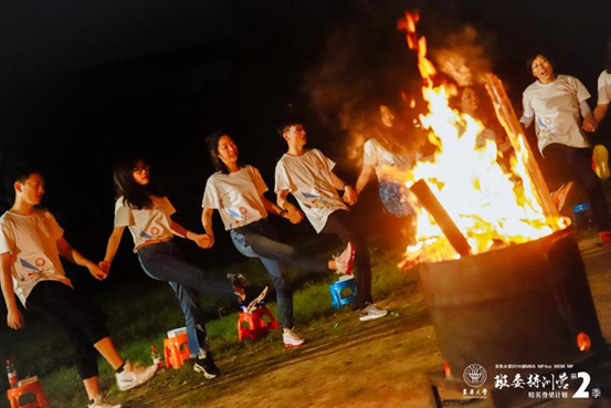 晚上还举行了篝火晚会,伴随着欢快的音乐,大家在教练的带领下围着篝火欢快地跳舞。在两队斗舞的环节,大家不约而同地推举了双方队长作为代表。于是完全不会跳舞还曾夸下海口要跳“极乐净土”的我,被赶着站到了对方队长戚嘉良的对面,然后毫无悬念地被他以相当风骚的舞姿秒杀。事实证明,男人骚起来真的没有妹子什么事了,戚同学完美地给我上了一课。最后随着大家一起牵手围着篝火在教练带领下尽情热舞,我们愉快地结束了第一天的特训。