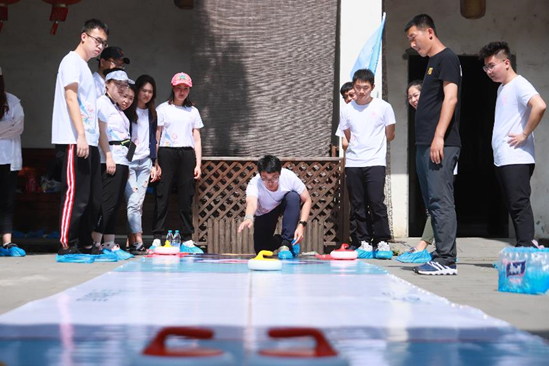在团队展示之后,我们开始了第一个环节——陆地冰壶。和传统运动项目冰壶相比,陆地冰壶除了场地和比赛器材不同之外,计分规则与比赛规则都完全一样,只不过为了让更多的队友参与比赛,每局比赛的出场人数设置为了8人。在比赛中每位队友都全力以赴希望为团队争得荣誉。但很可惜,可能由于大家比较心急,没有很好地总结每局比赛的经验教训,也没有很好地与队友进行沟通,最终我们在领先的情况下被对方“火箭队”翻盘,输掉了整场比赛。