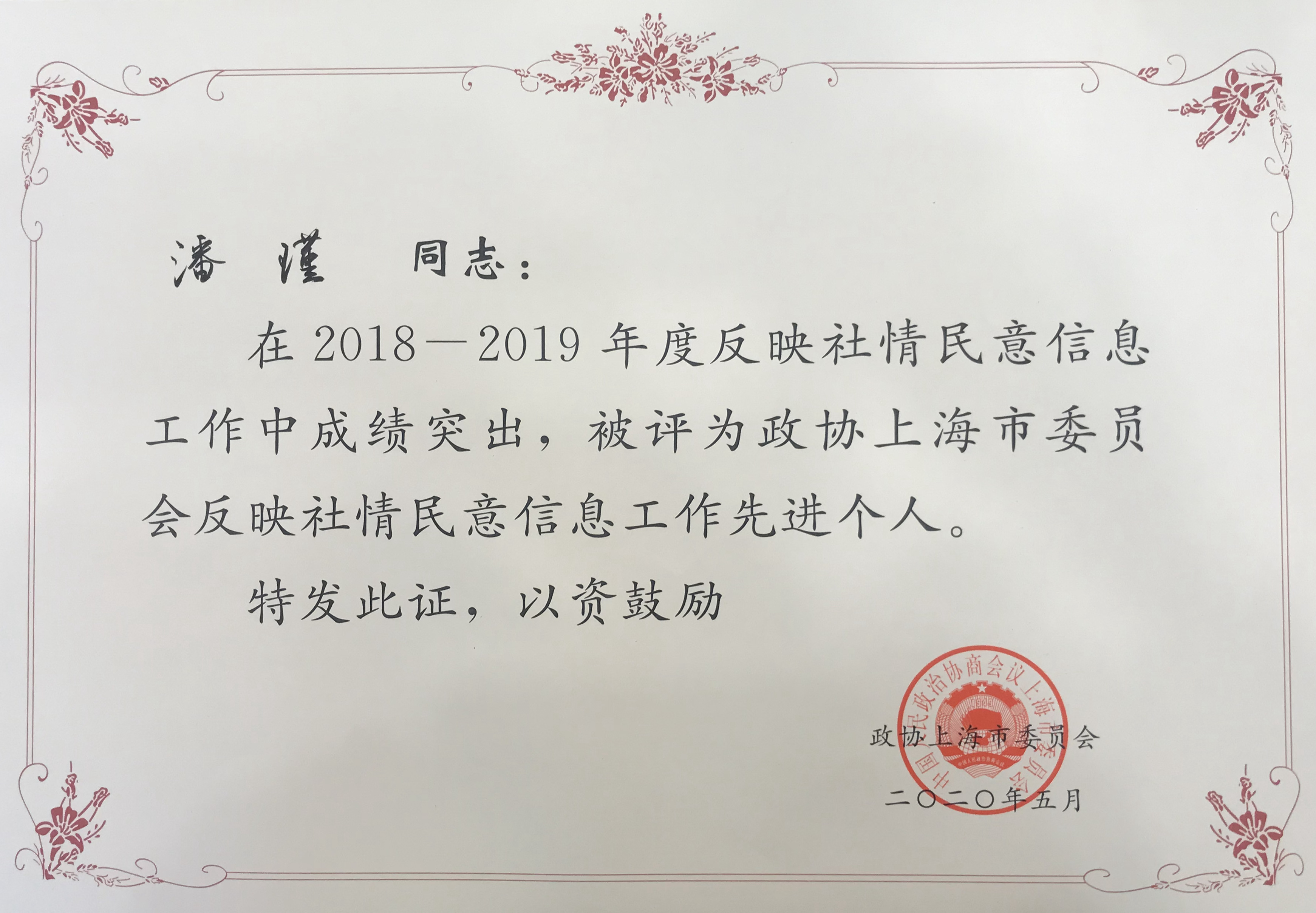 5月13日,上海市政协召开社情民意信息工作会议,深入贯彻中央和市委政协工作会议精神,总结经验、明确思路,就进一步做好反映社情民意信息工作作出部署。会议表彰了反映社情民意信息工作先进单位、先进个人。市政协委员潘瑾获得先进个人(全市共20名,含在沪全国政协委员),继2015-2016年度后再获殊荣。