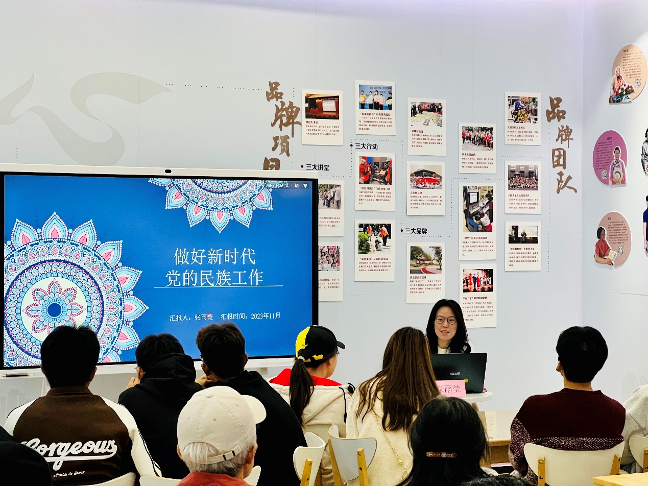 (张雨莹为师生居民讲解新时代党的民族工作) 在“基地”长宁区民族宗教工作办公室副主任张雨莹对东华大学师生的到来表示欢迎。她给与会师生居民生动的讲解新时代党的民族工作并勉励同学们努力传好“家在华阳”的接力棒。