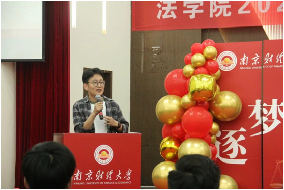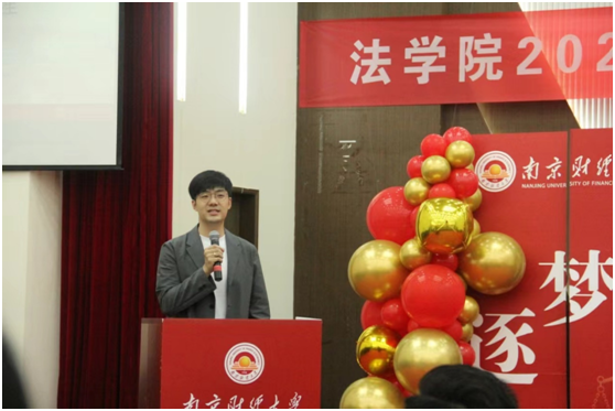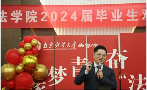 优秀校友代表,北京观韬中茂(南京)律师事务所管理合伙人、南京市律师协会副秘书长王政律师也在典礼上发言。他表达了对母校的感激之情和对未来的美好憧憬,回顾了在校期间的点点滴滴,分享了自己的成长经历和感悟。同时,他以“内卷”和“躺平”两个关键词给同学们上了一堂职业生涯规划课。他说真正的内卷并不可怕,作为时代新人,同学们应当做到的是正视内卷,拒绝躺平。要充分发挥能动性,积极拓展外部资源,避免低水平重复的内卷。同时,要勇于创新,积极发掘内部潜力,习惯在环境的约束下挖掘潜能。