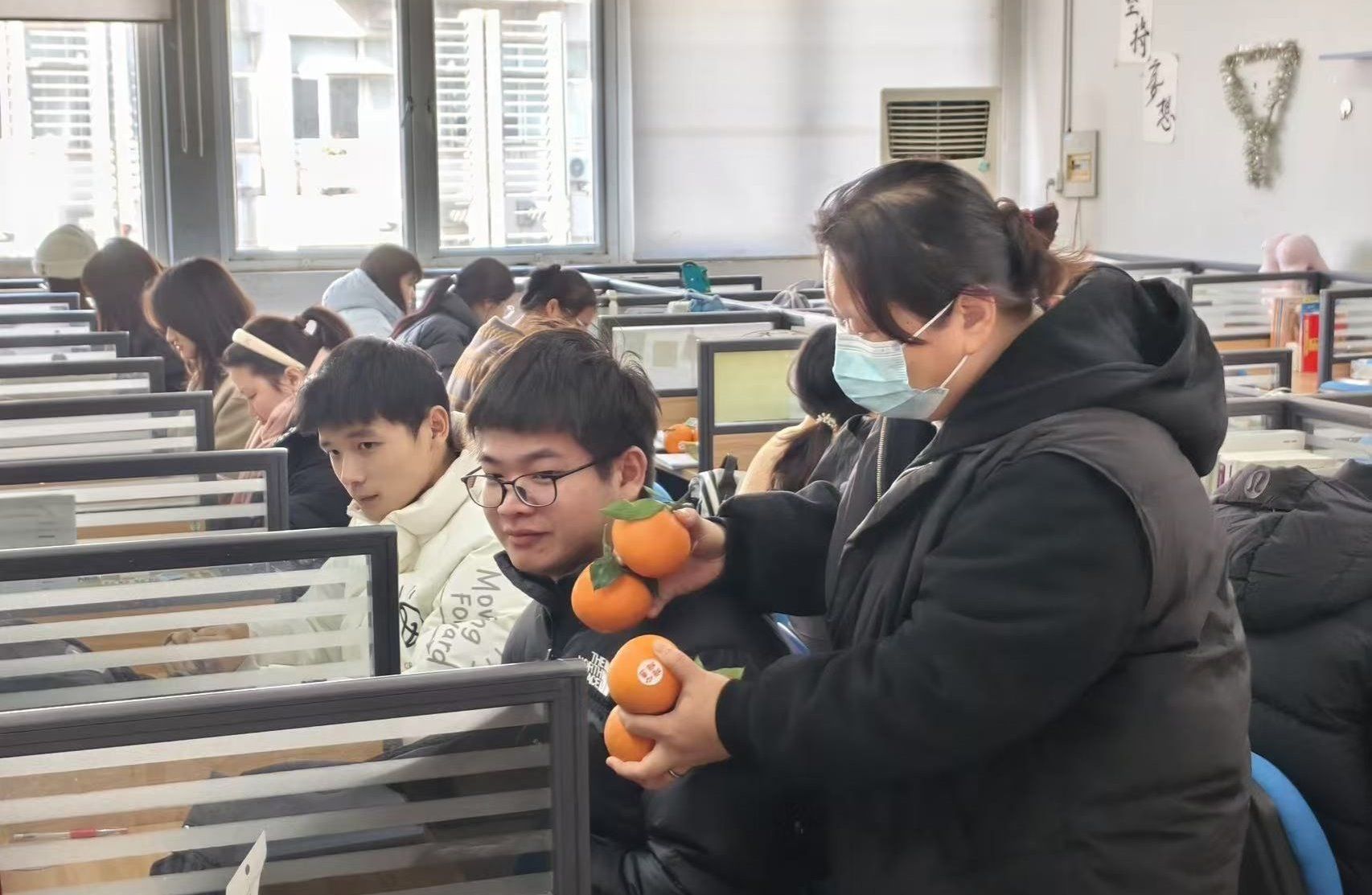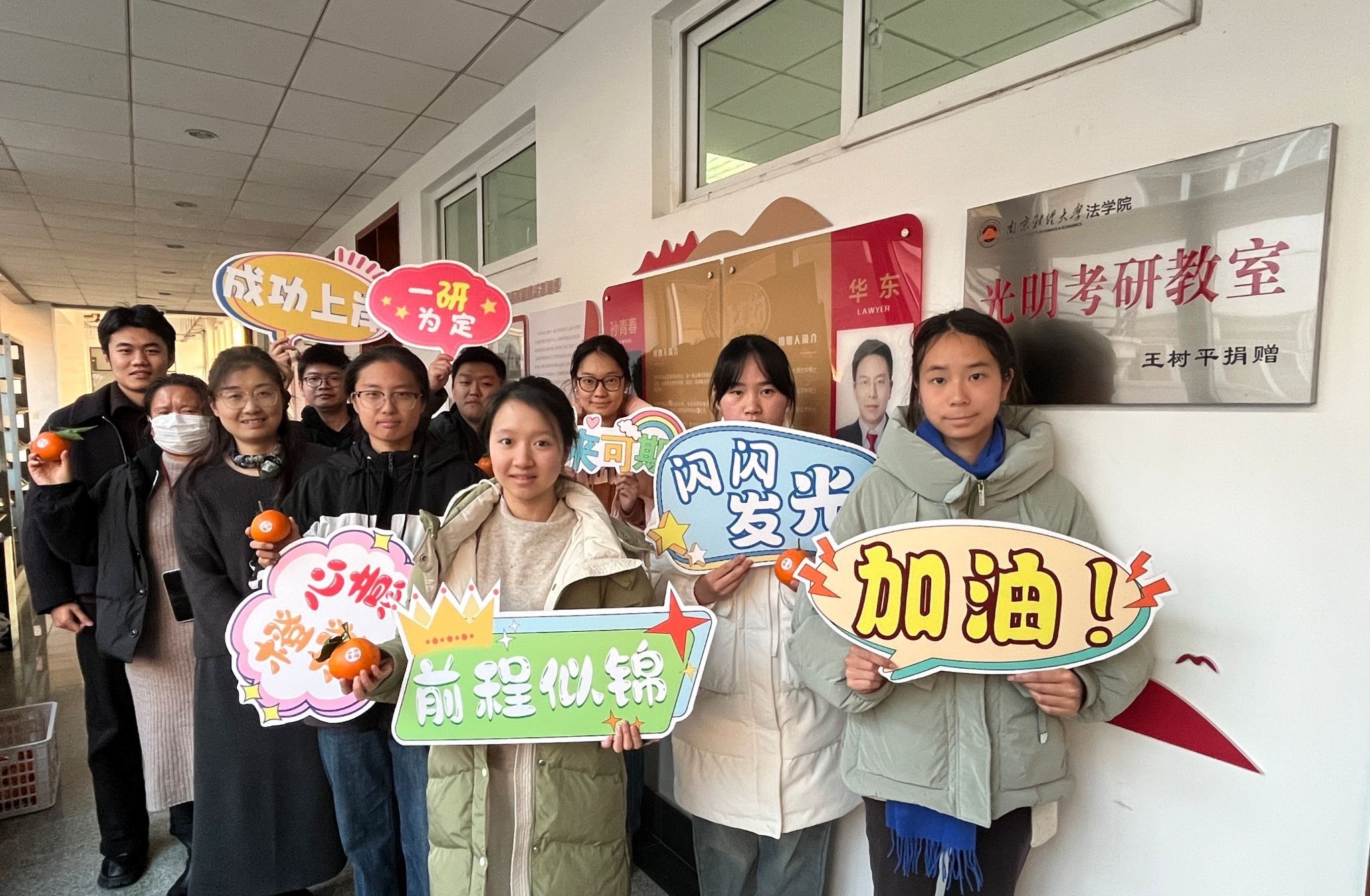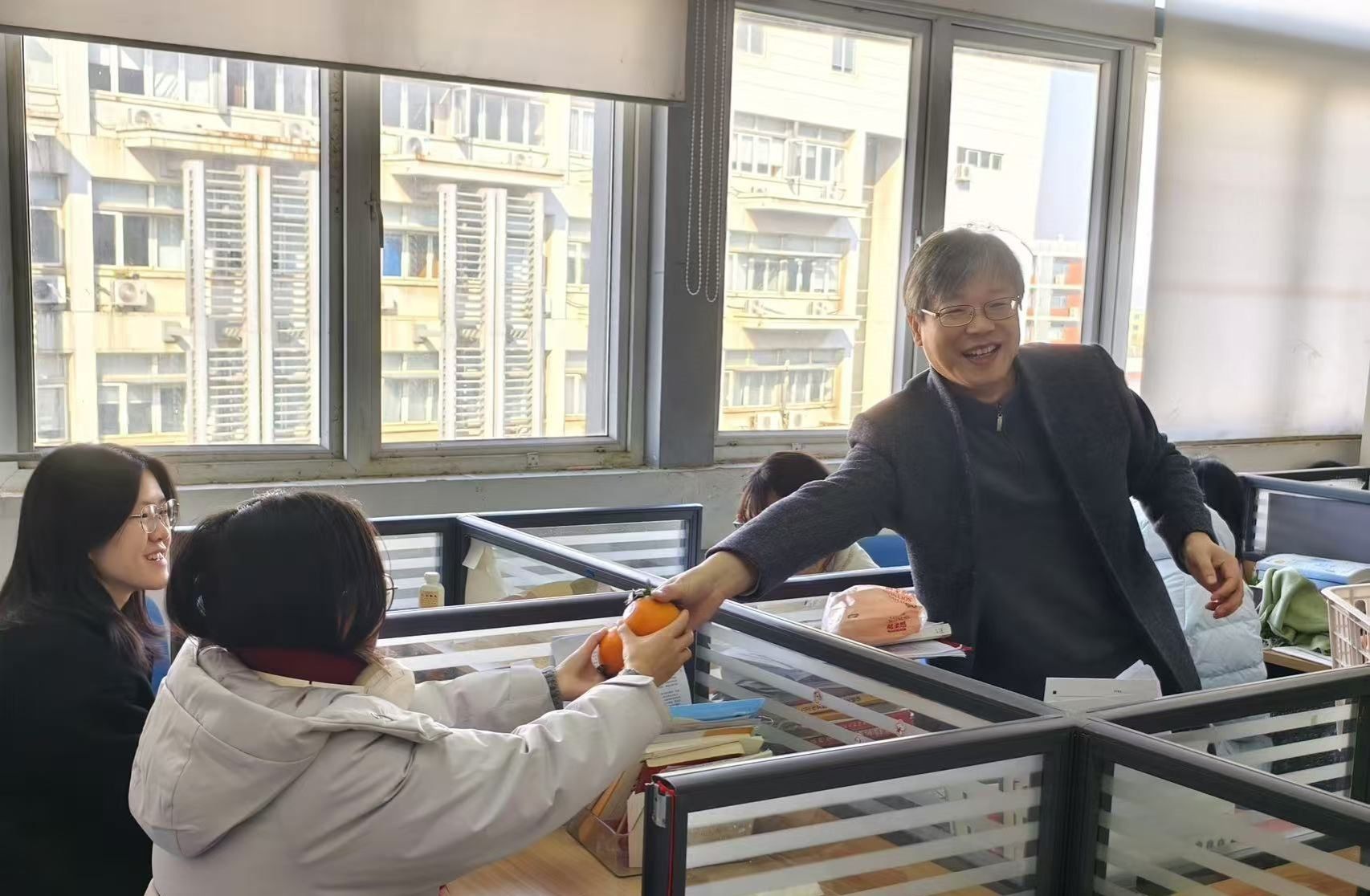 黄建国书记与考研学生亲切交流,询问他们的复习进度、备考情况。考研已进入冲刺决胜阶段,他希望同学们在考研复习关键时期能抓紧时间、坚定信念,考出好成绩。刘英华副书记叮嘱同学们要保持良好的心态,在备考的最后阶段要注意劳逸结合,张弛有度。随后,三位老师为同学们发放慰问品。“心想事‘橙’、‘橙’功上岸”,每个橙子蕴含着对考研学子的美好祝福,祝愿每一位学子都能实现考研梦想,高分上岸。