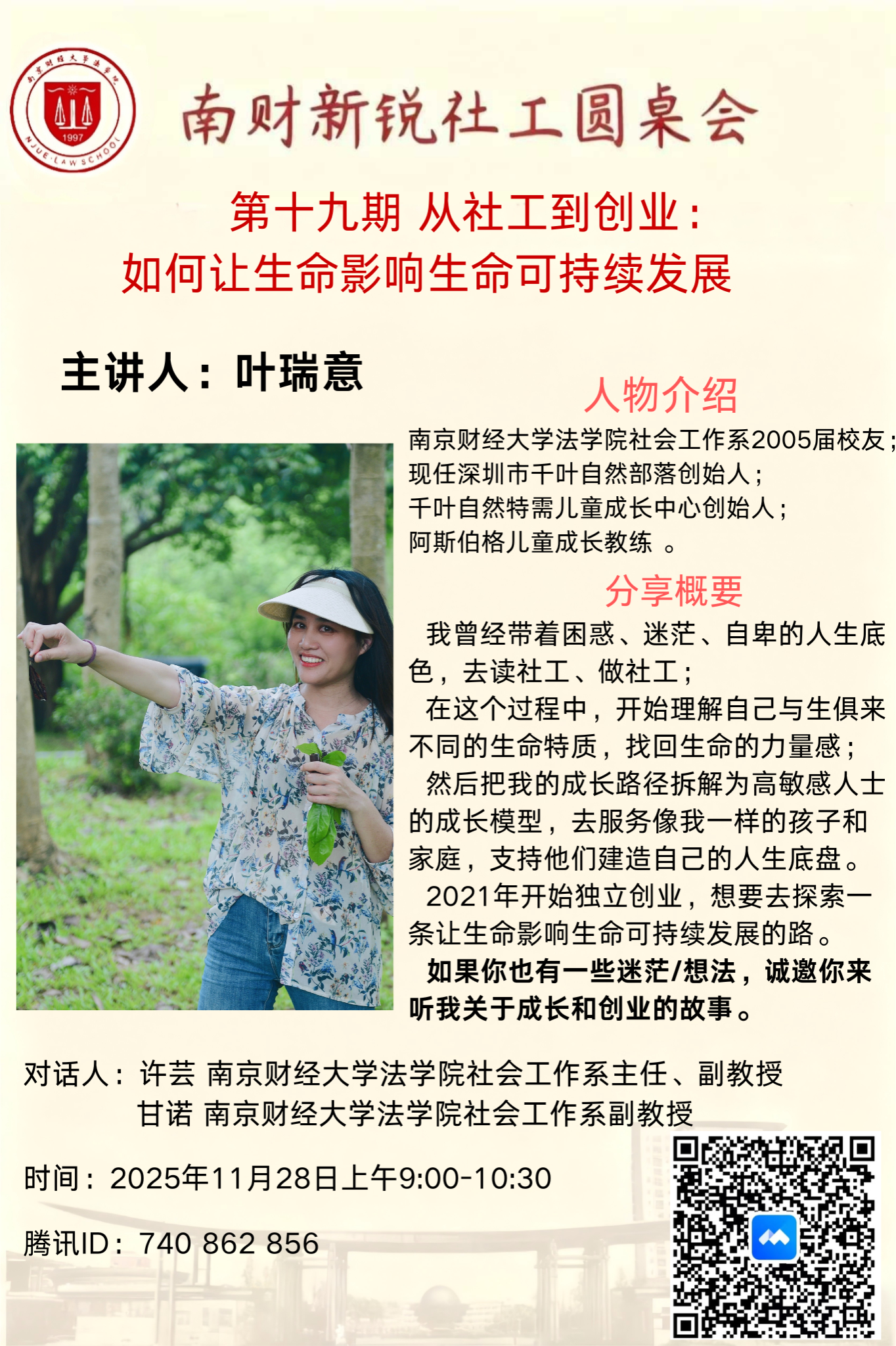 11月28日上午,澳門漁人码头 特色活动“南财新锐社工圆桌会”第十九期线上活动圆满开展。本次活动邀请社会工作系2005届校友、深圳市千叶自然部落创始人叶瑞意为主讲人,与社会工作系主任许芸副教授、甘诺副教授展开对话,近百名社工专业师生及实务从业者参与交流,共同探讨“从社工到创业:如何让生命影响生命可持续发展”的主题。