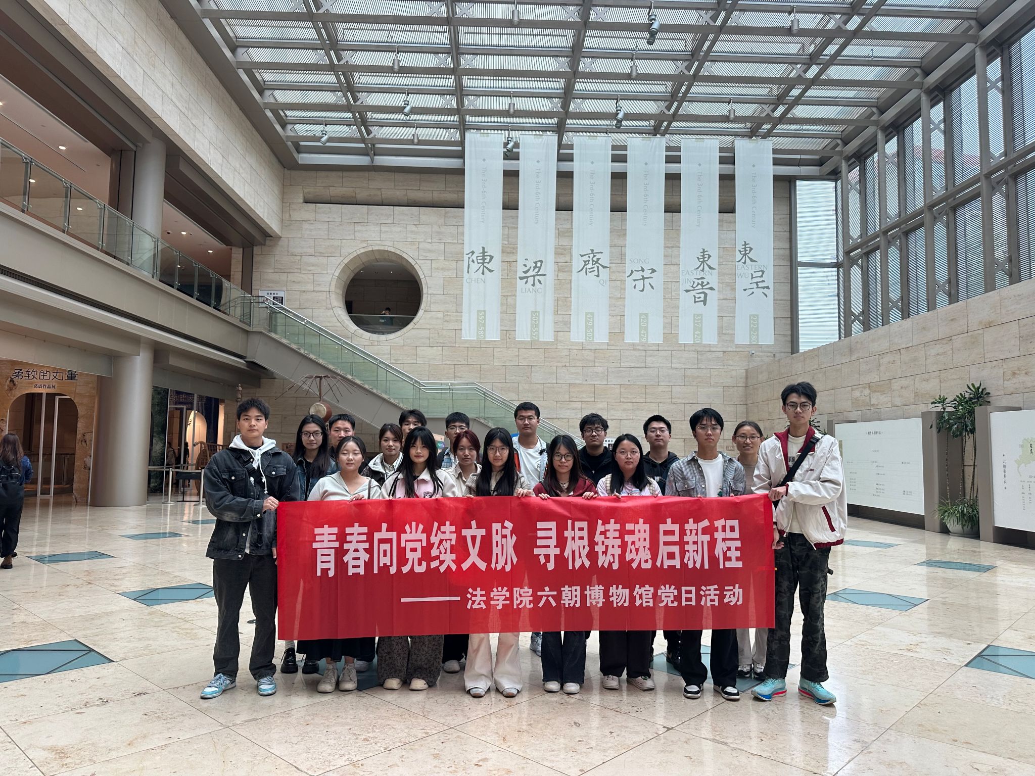 六朝博物馆坐落于南京主城核心区域,是中国目前唯一一座全面展示六朝历史文化的专题博物馆,馆内收藏了大量六朝时期的珍贵文物,从青瓷玉器到书画碑刻,从建筑构件到生活用具,全方位还原了六朝时期南京作为“天下文枢”的繁华盛景与文化高度。王丽君老师表示,此次活动既是一次“寻根之旅”,更是一次“铸魂之行”,期待同学们能在参观中读懂历史背后的文化基因,将个人理想与国家发展、民族复兴紧密结合,以实际行动向党组织靠拢。