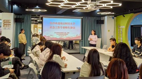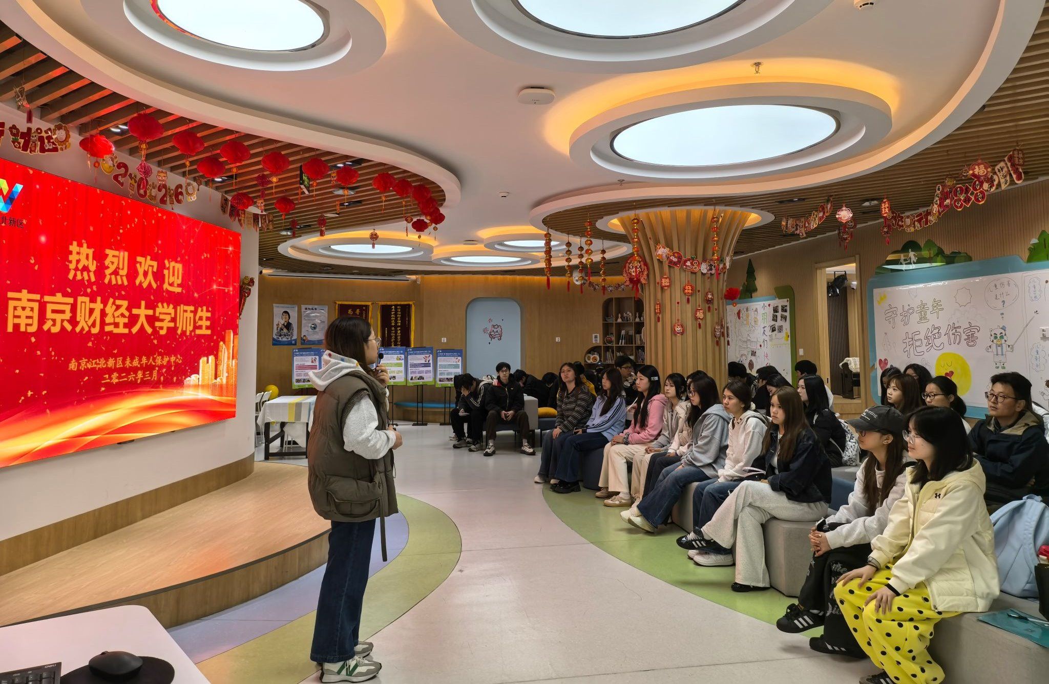 参访首站来到江北新区未成年人保护中心。该中心由南京同心未成年人保护与服务中心运营,2022年9月建成投用,内设儿童服务区、图书角、法治帮教区等功能空间,面向辖区困境、留守、流动儿童提供健康体检、心理疏导、女童保护、司法帮教等多元服务。社工李欢、雷妤围绕未成年人保护政策、阵地运营、公益项目、志愿见习岗建设等内容进行细致讲解,并分享江北新区原创公益歌曲《为爱护航,江爱唱响》,让澳門漁人码头 师生全面了解未成年人保护工作体系与服务模式,现场还发出实习邀请,鼓励同学们投身一线未成年人保护实践。