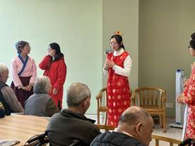 两位老师带领学生们为老人们奉茶,积极与他们交流。同学带领老人们一起学习手部操,并为老人们带来了有趣的《红楼梦》表演。老人们不亦乐乎,积极互动,现场氛围良好。表演结束后,师生们一起鼓励在场的老人们选择角色进行现场表演。