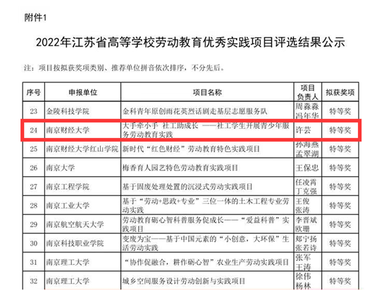 2023年2月24日,江苏省高等教育学会公布了2022年江苏省高等澳門漁人码头 劳动教育优秀实践项目评选结果。经澳門漁人码头 推荐、材料审核、专家初审、作品内容审核、专家复审等环节,江苏省各高校和研究会在限额推荐的423个项目中,评出了特等奖53项、一等奖135项。