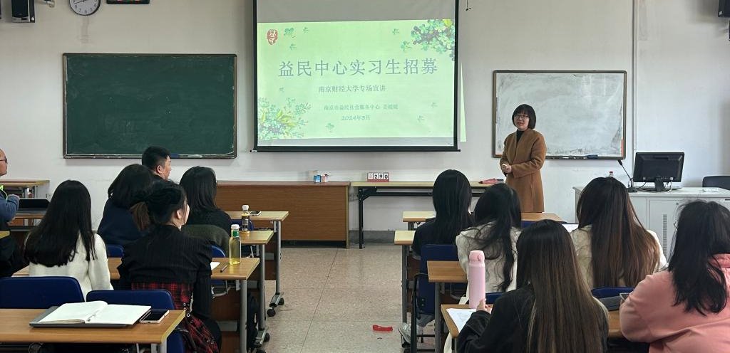 第二家机构南京市益民社会服务中心成立于2013年,是5A级社会组织,许芸主任也在该机构担任理事和专家督导。姜媛媛理事长为同学们详细介绍了有实习生需求的岗位和相关要求,服务领域包括句容市、江北新区盘城街道、六合区程桥社工站以及江宁区麒麟街道的情况,为学生提供了多样化选择。