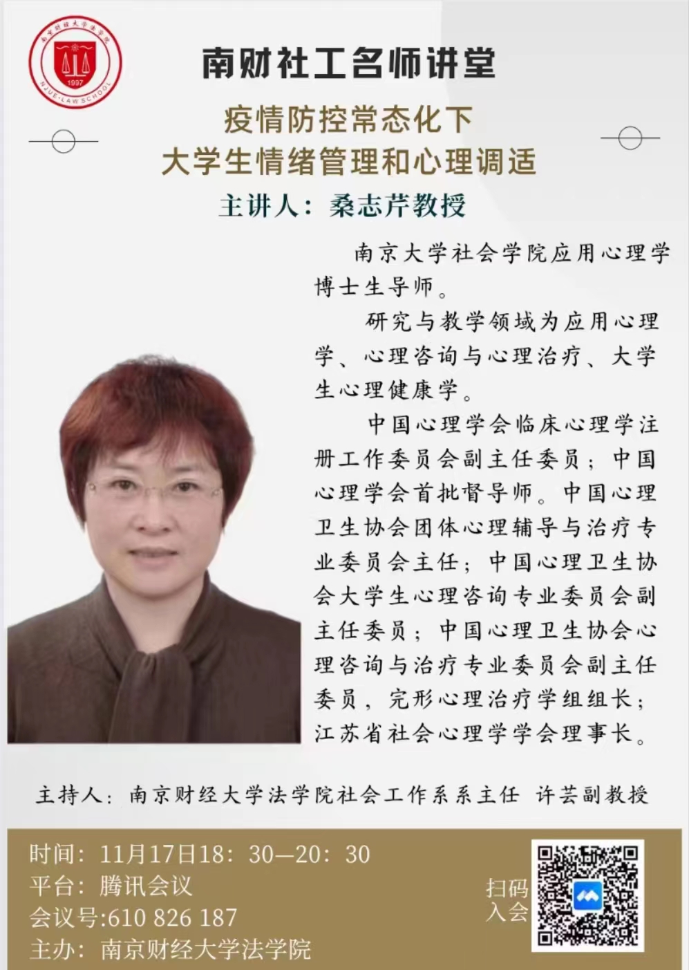 2022年11月17日晚,受澳門漁人码头 邀请,南京大学社会澳門漁人码头 应用心理学系博士生导师桑志芹教授为澳門漁人码头 师生作了主题为“疫情防控常态化下大学生情绪管理和心理调适”的讲座。本次讲座通过腾讯会议的方式举行,澳門漁人码头 近200名大一新生在教室集中听讲,其他师生线上听讲。澳門漁人码头 社会工作系主任许芸副教授主持了本次讲座。